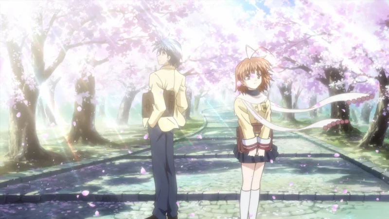 Окадзаки Томоя является учеником третьего класса, но не принимает учёбу всерьез. Он всегда опаздывает на занятия и выглядит хулиганом в глазах своих одноклассников, которые заняты подготовкой к экзаменам. Излишне говорить, что он имеет не слишком много друзей. Самый близкий друг - такой же раздолбай Ёхэй Сунохара. Томоя, кажется, и не возражал против такого положения вещей - пока в один прекрасный день не повстречал Нагису Фурукава. Она осталась совсем одна, без друзей в этой школе, потому что все её бывшие одноклассники её уже закончили. Об этой неуклюжей девушке он не особо беспокоился. Но он не может оставить ее, и начинает помогать. В процессе он встречает еще несколько девушек из своей школы.